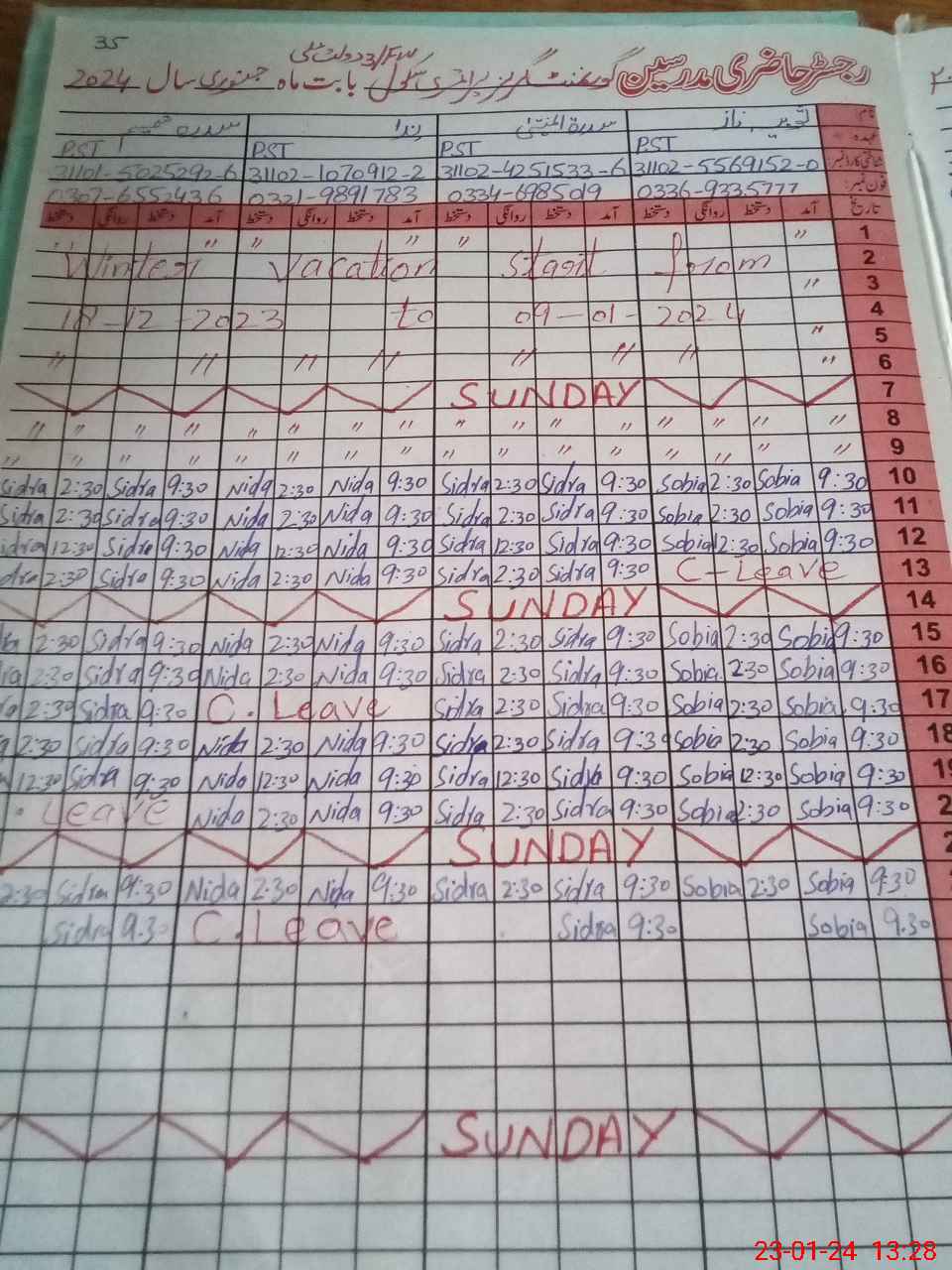| CNIC | Full Name | Designation | R/C | Absence During Last Calender Month |