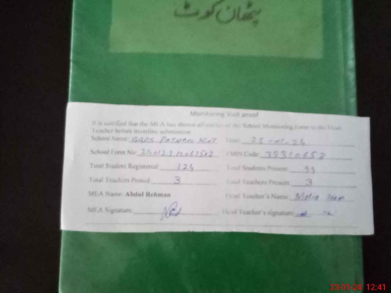 | Attendance Register | Head Teacher | MEA with School | Visit Proof |