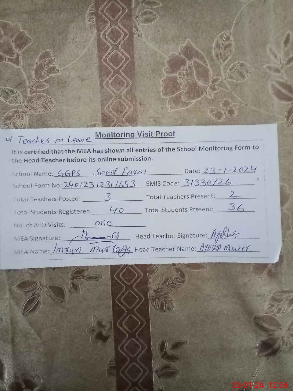 | Attendance Register | Head Teacher | MEA with School | Visit Proof |
