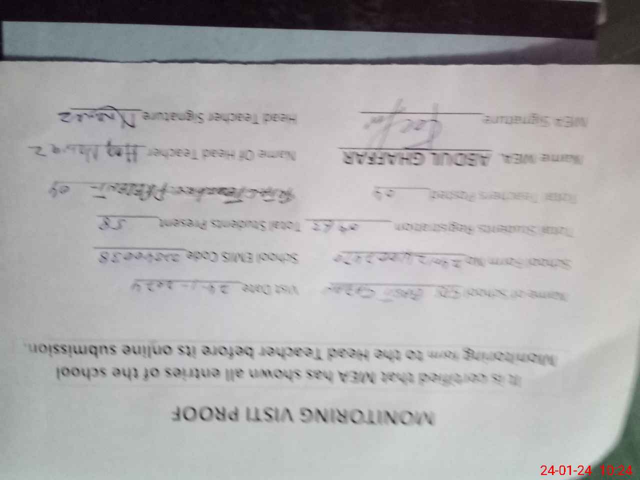 | Attendance Register | Head Teacher | MEA with School | Visit Proof |