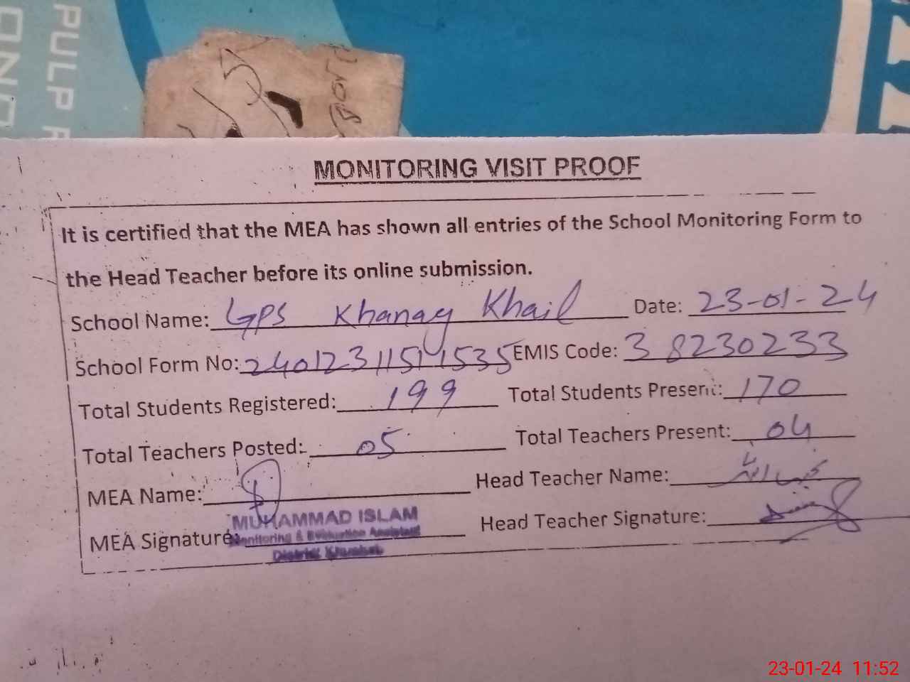 | EMIS Code: 38230233 | Name of School: GPS KHANAY KHAIL | |||