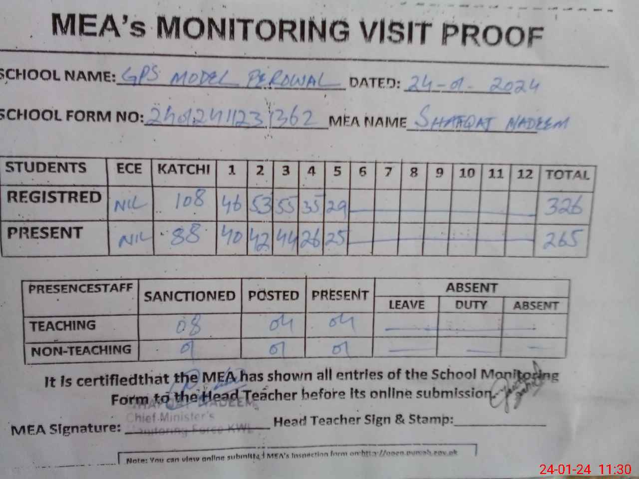 | Attendance Register | Head Teacher | MEA with School | Visit Proof |