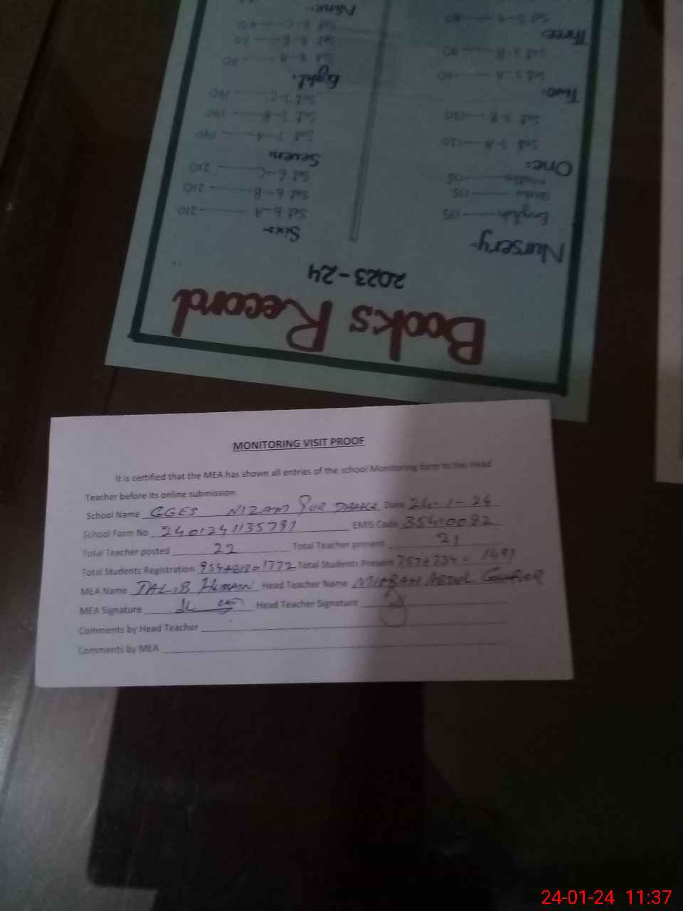 | Attendance Register | Head Teacher | MEA with School | Visit Proof |