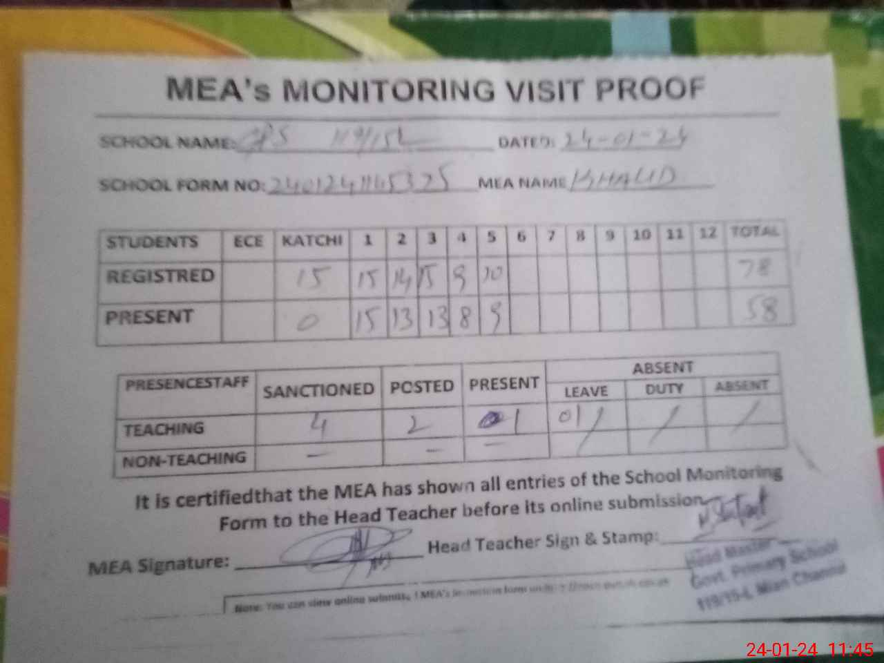 | Attendance Register | Head Teacher | MEA with School | Visit Proof |