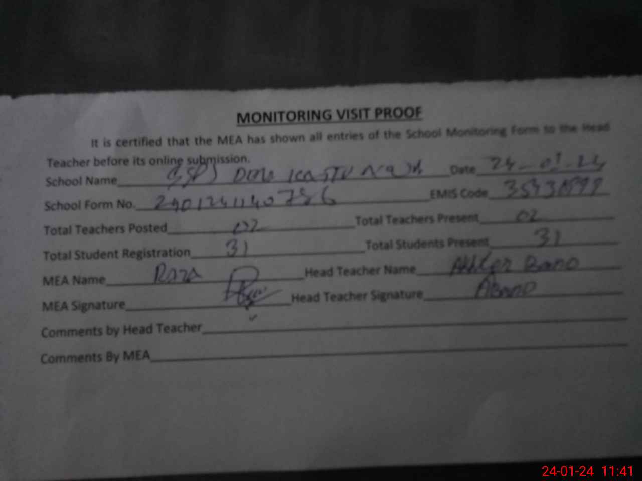 | Attendance Register | Head Teacher | MEA with School | Visit Proof |