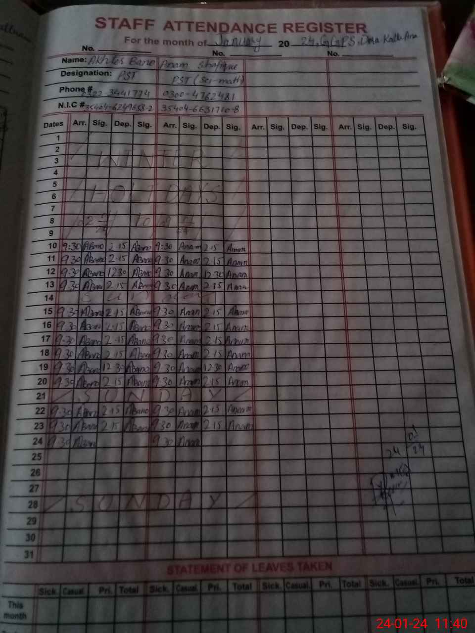 | Name: An**** Sh**** Designation: (School Headmaster's/Headmistress's) PST Phone/Cell Number: 03**** |