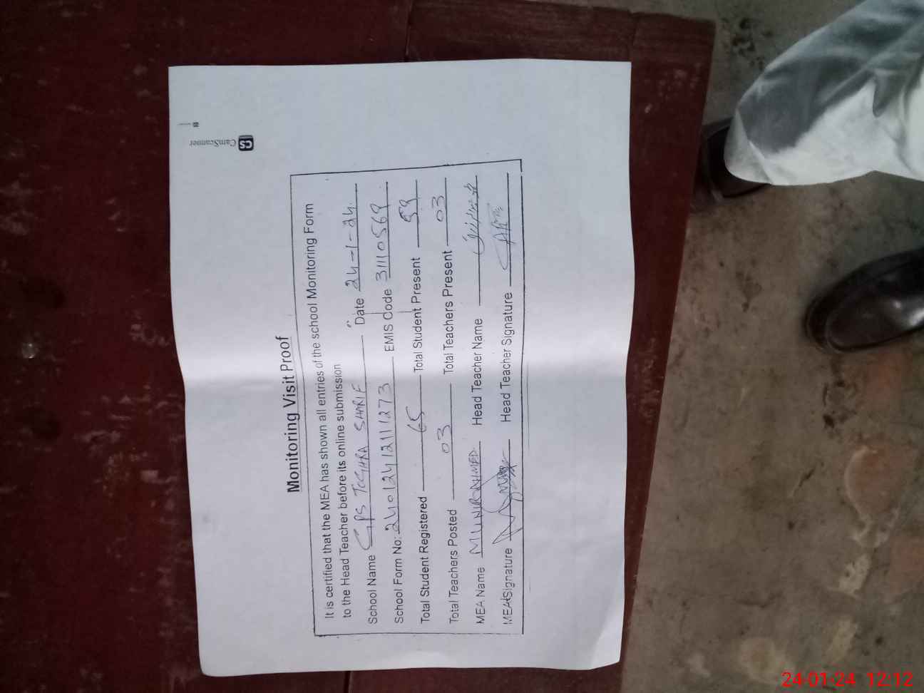 | Attendance Register | Head Teacher | MEA with School | Visit Proof |