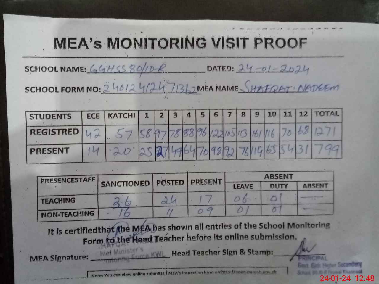 | Attendance Register | Head Teacher | MEA with School | Visit Proof |