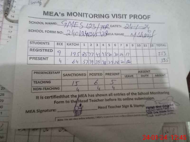 | Attendance Register | Head Teacher | MEA with School | Visit Proof |