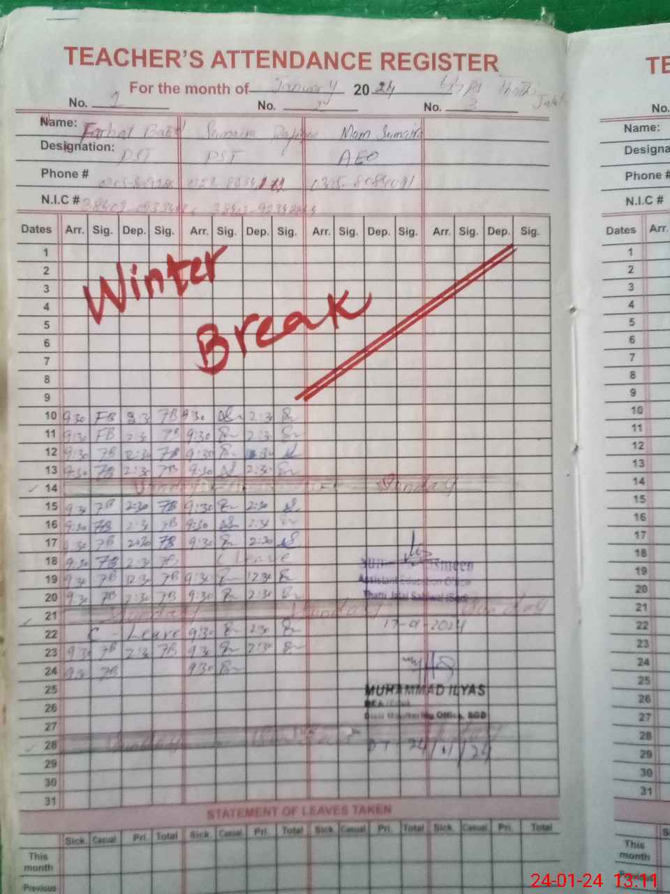 | CNIC | Full Name | Designation | R/C | Absence During Last Calender Month |