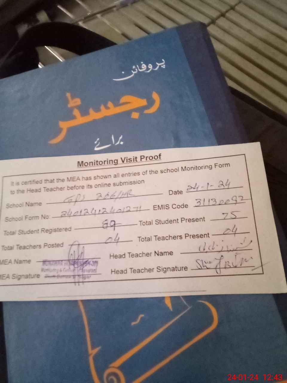 | Attendance Register | Head Teacher | MEA with School | Visit Proof |