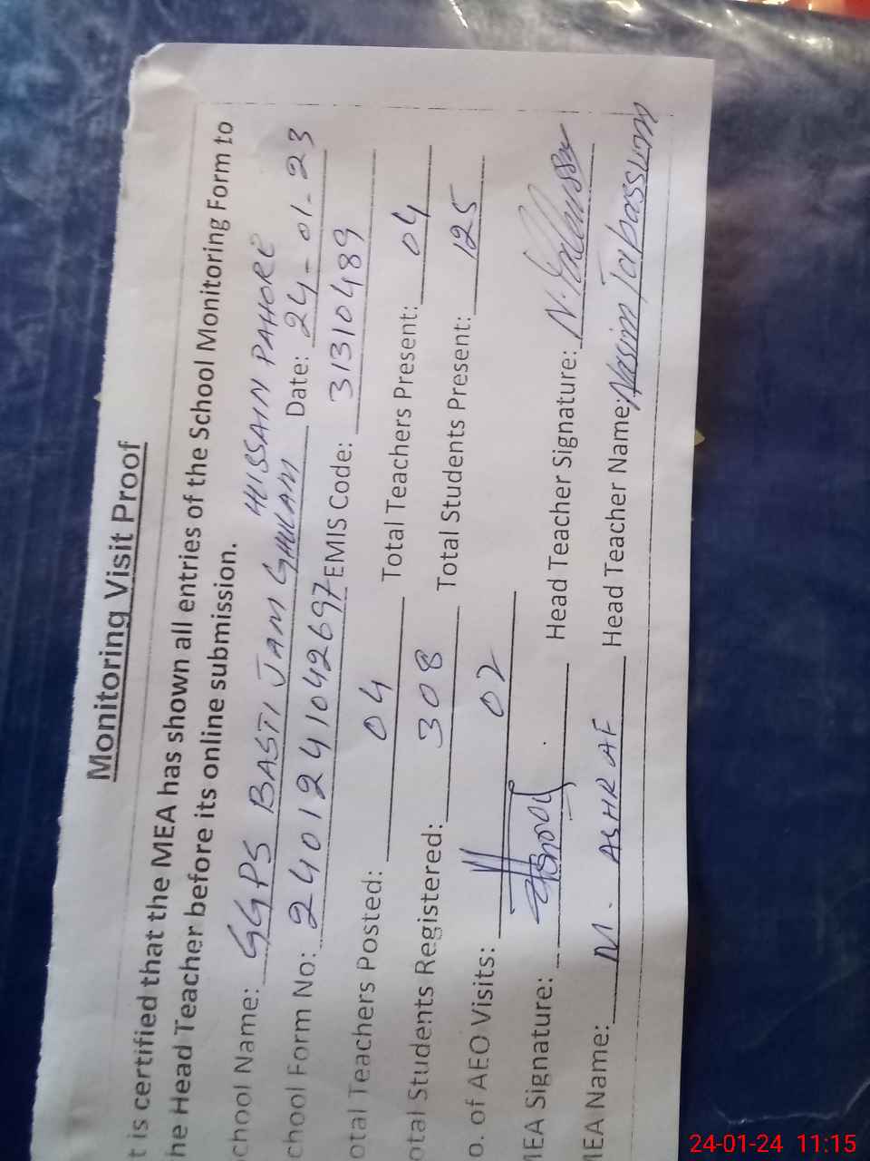 | EMIS Code: 31310489 | Name of School: GGPS BASTI JAM GHULAM HASSAN PAHOR (After Noon) | |||
