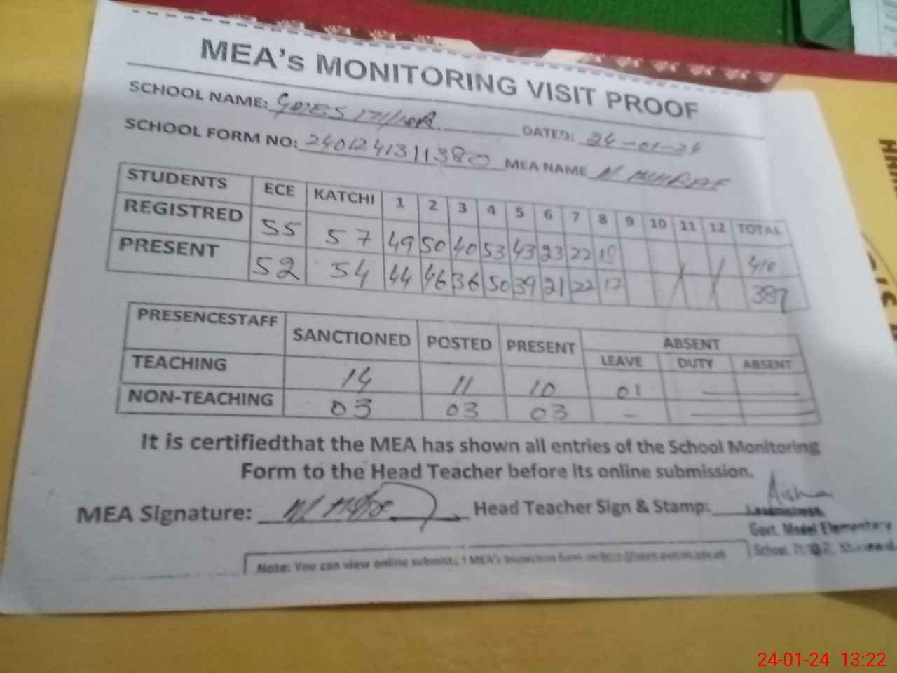 | Attendance Register | Head Teacher | MEA with School | Visit Proof |