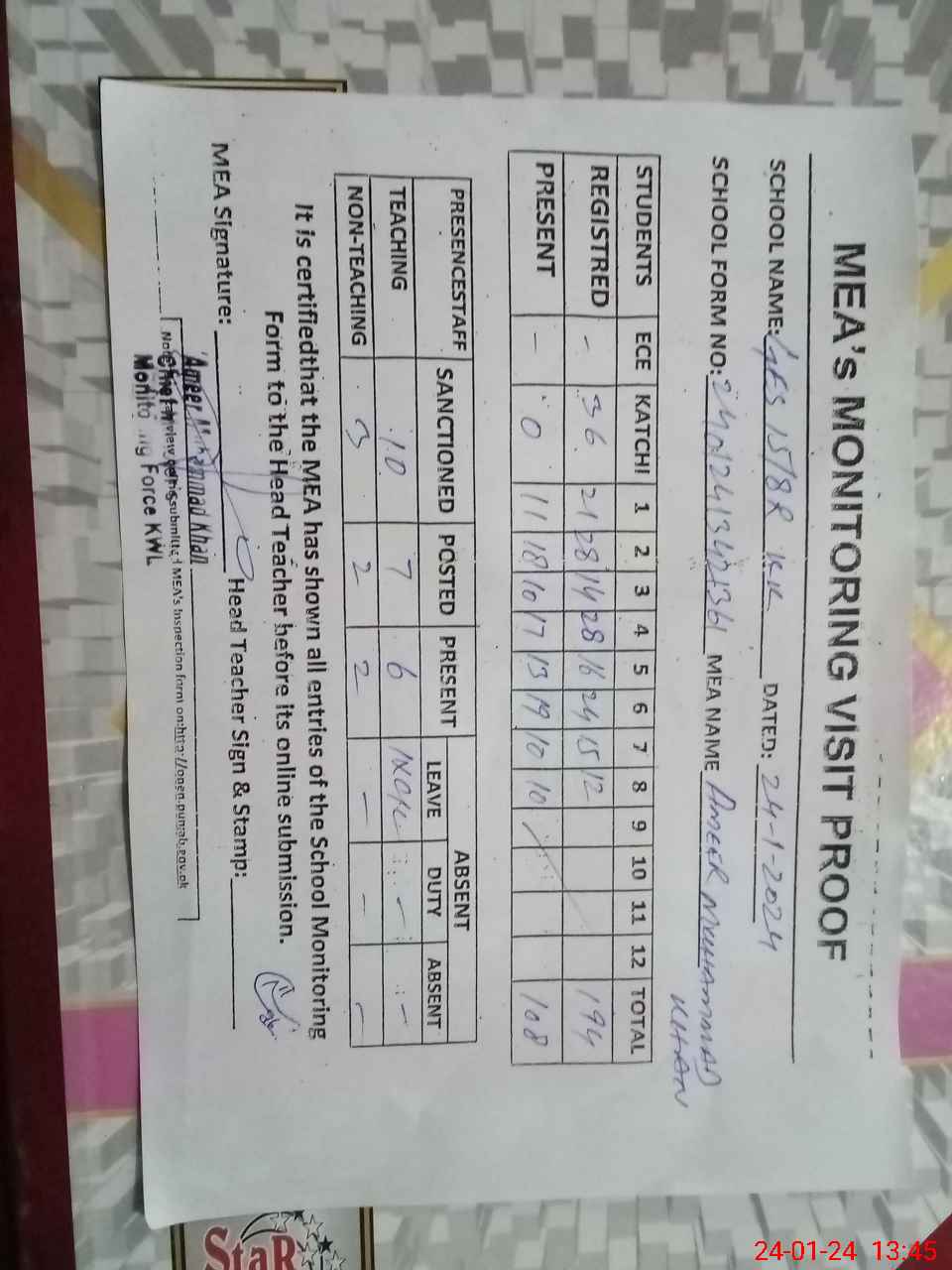 | Attendance Register | Head Teacher | MEA with School | Visit Proof |