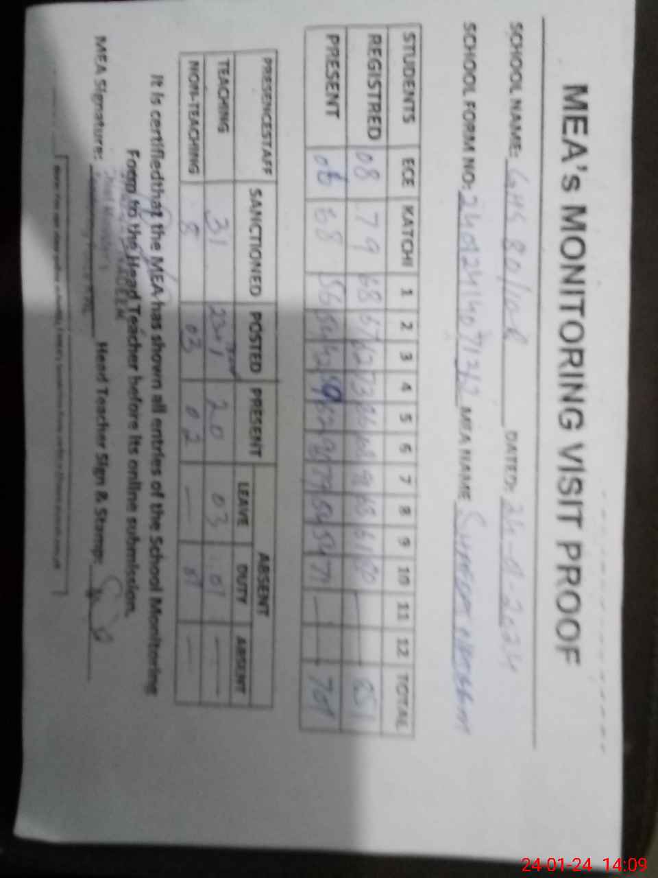 | Attendance Register | Head Teacher | MEA with School | Visit Proof |