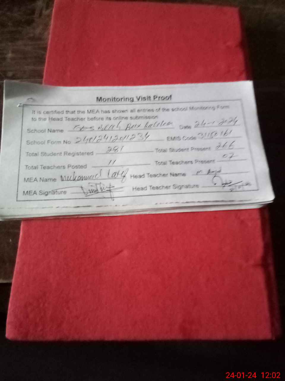 | Attendance Register | Head Teacher | MEA with School | Visit Proof |