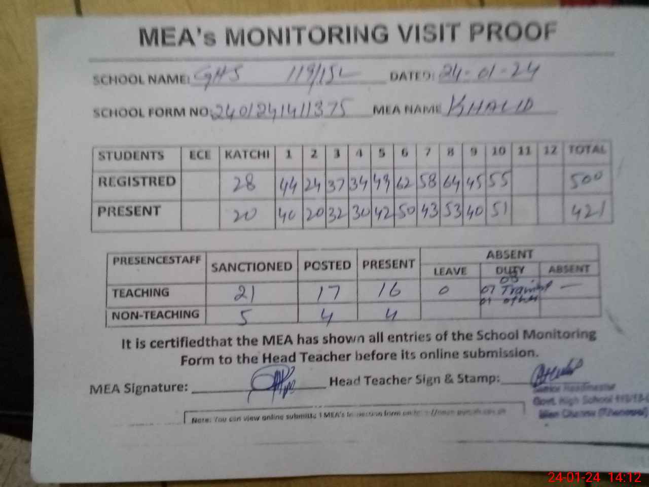 | Attendance Register | Head Teacher | MEA with School | Visit Proof |