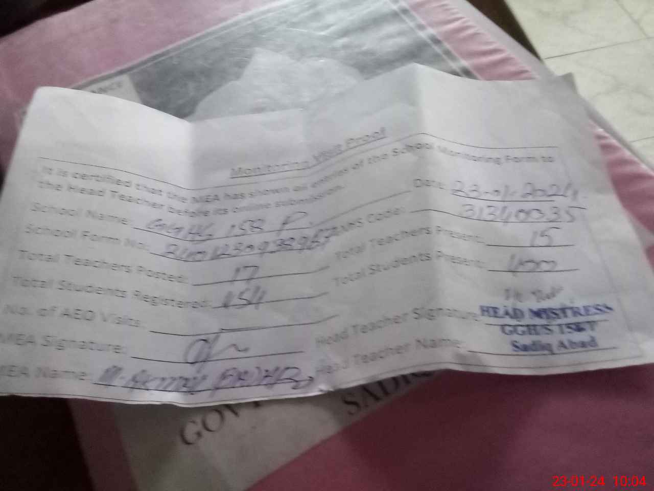 | Name: As**** Am**** Designation: (School Headmaster's/Headmistress's) Incharge HEADMistress Phone/Cell Number: 03**** |