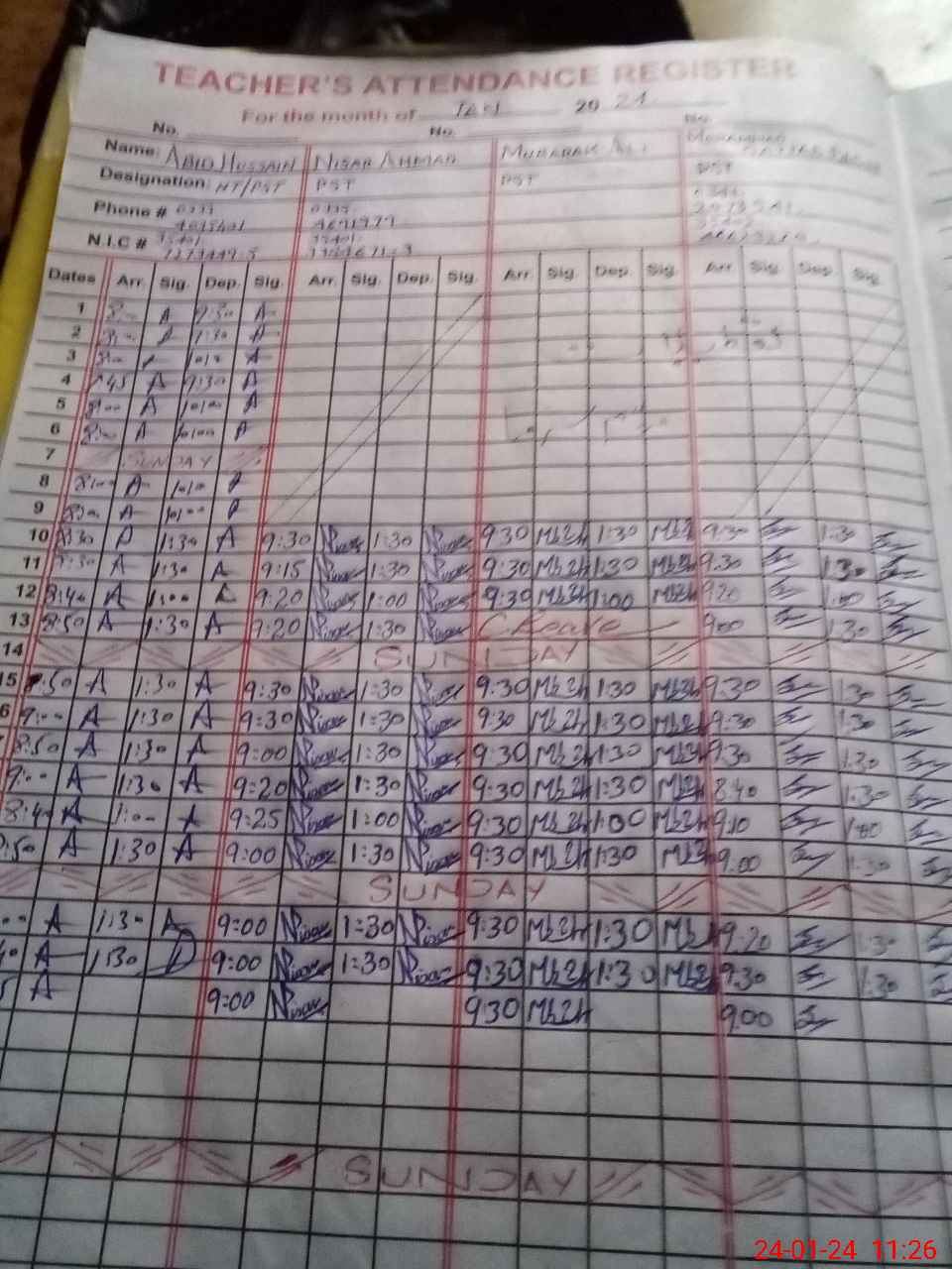 | CNIC | Full Name | Designation | R/C | Absence During Last Calender Month |