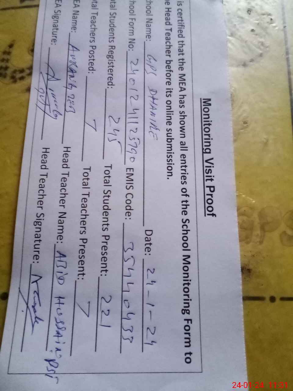 | Attendance Register | Head Teacher | MEA with School | Visit Proof |