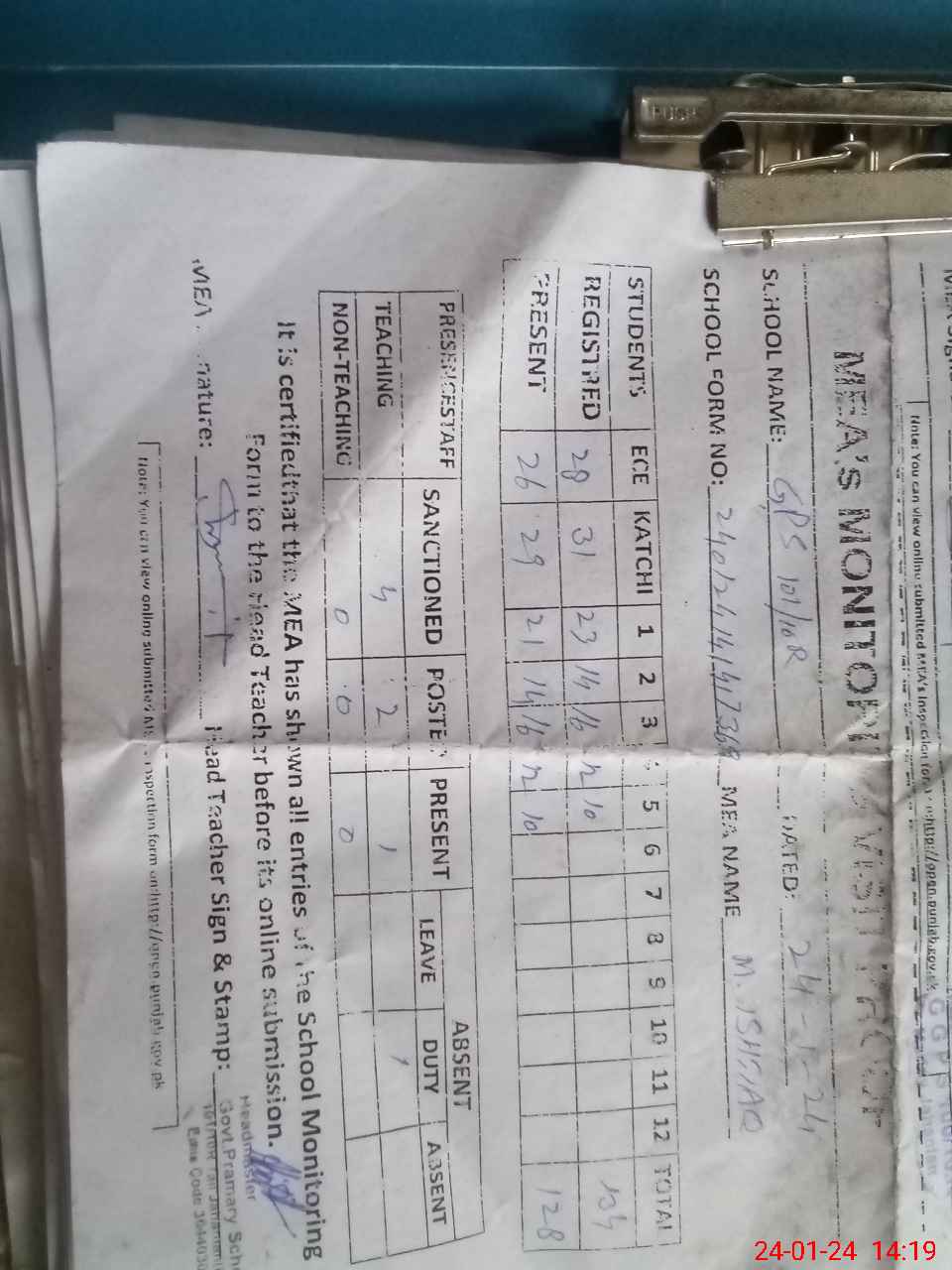 | Attendance Register | Head Teacher | MEA with School | Visit Proof |