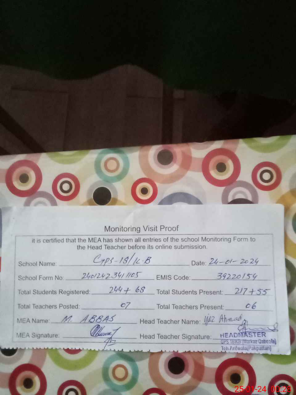 | EMIS Code: 39220154 | Name of School: GPS CHAK NO. 18 KB | |||