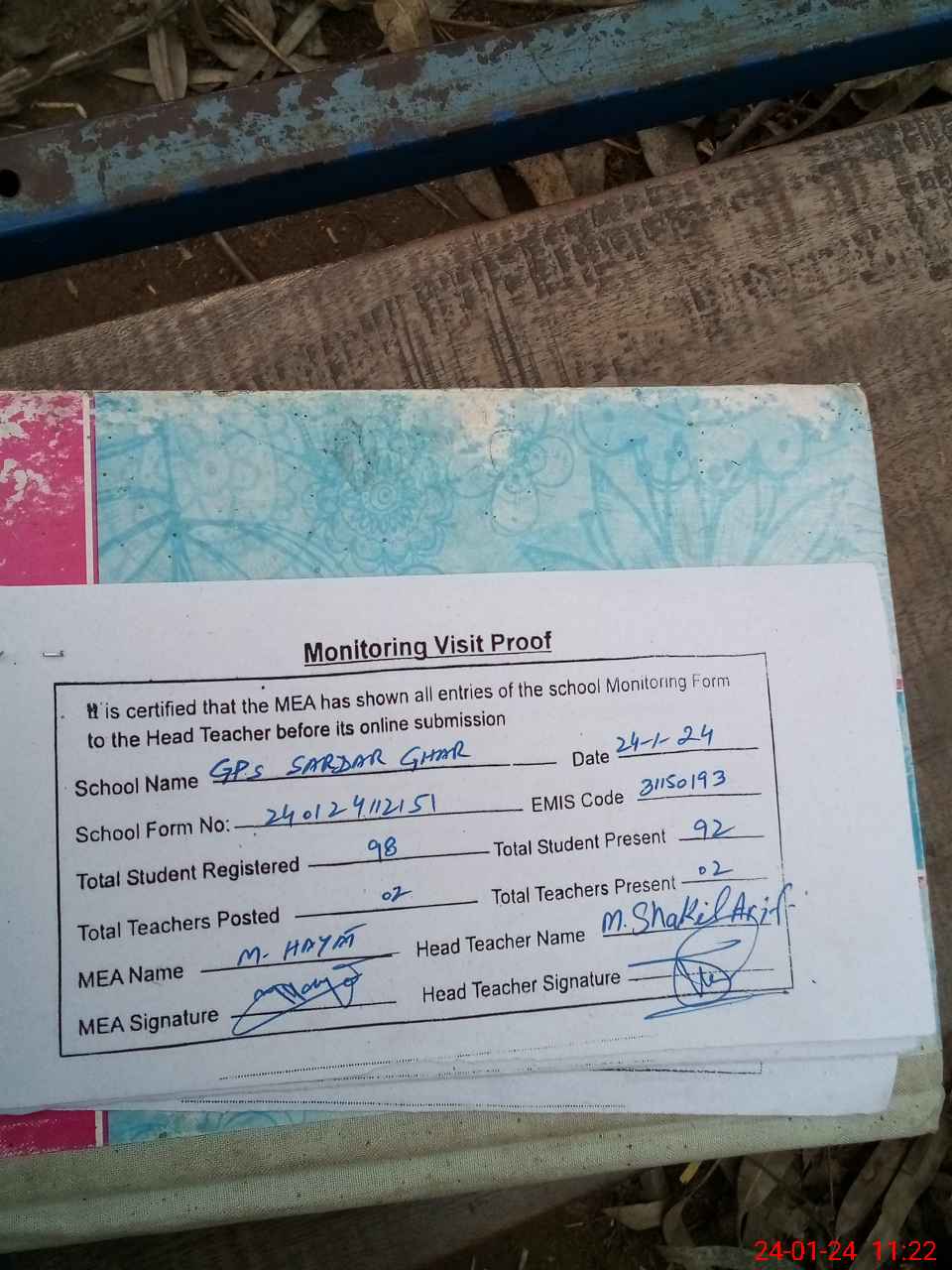 | Attendance Register | Head Teacher | MEA with School | Visit Proof |