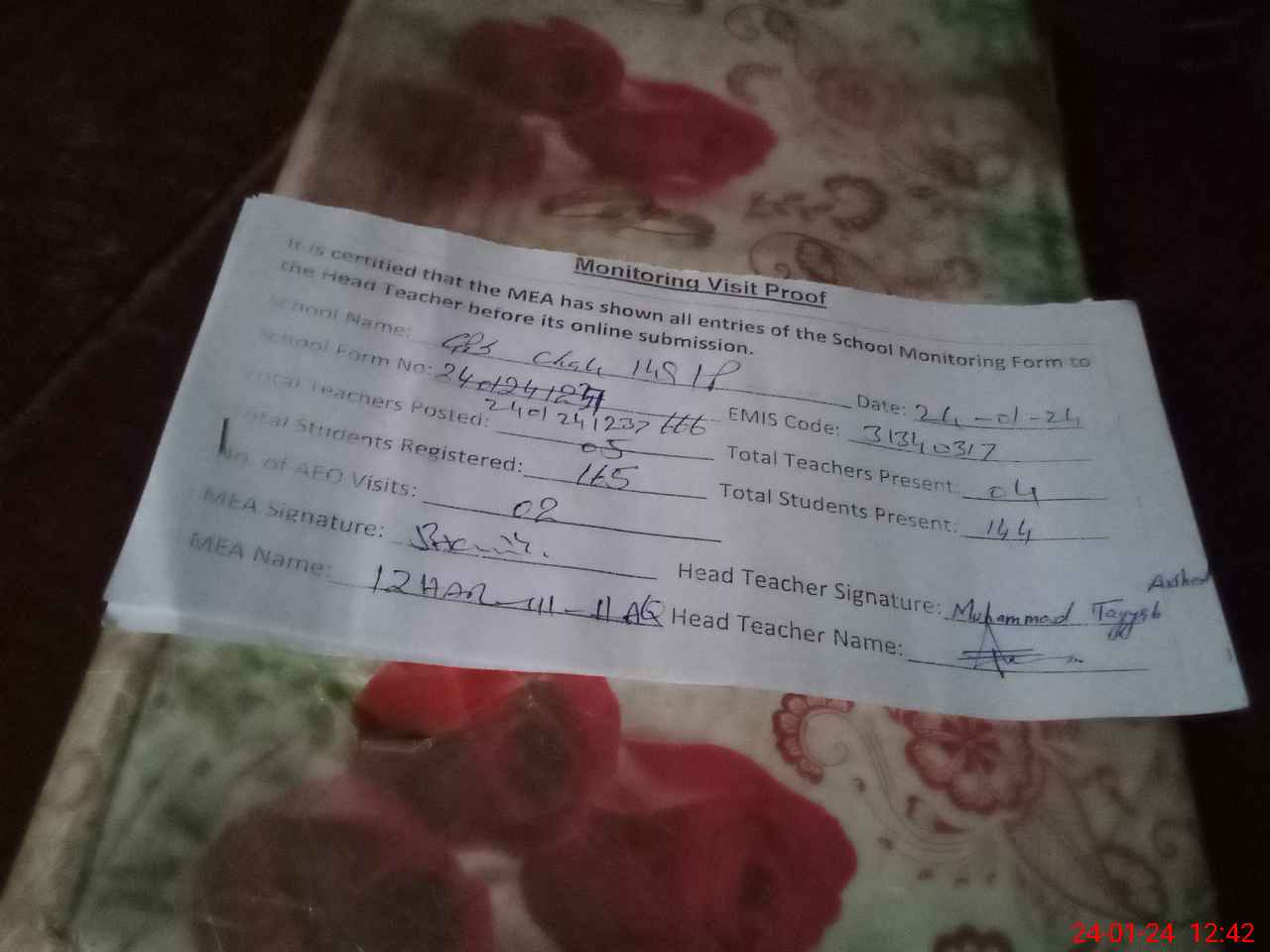 | Attendance Register | Head Teacher | MEA with School | Visit Proof |