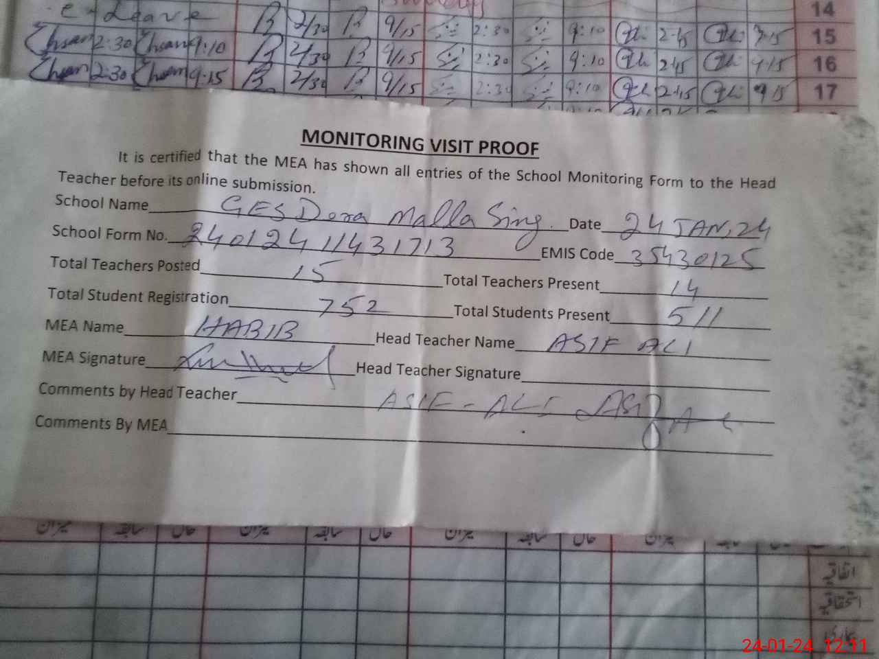| Attendance Register | Head Teacher | MEA with School | Visit Proof |
