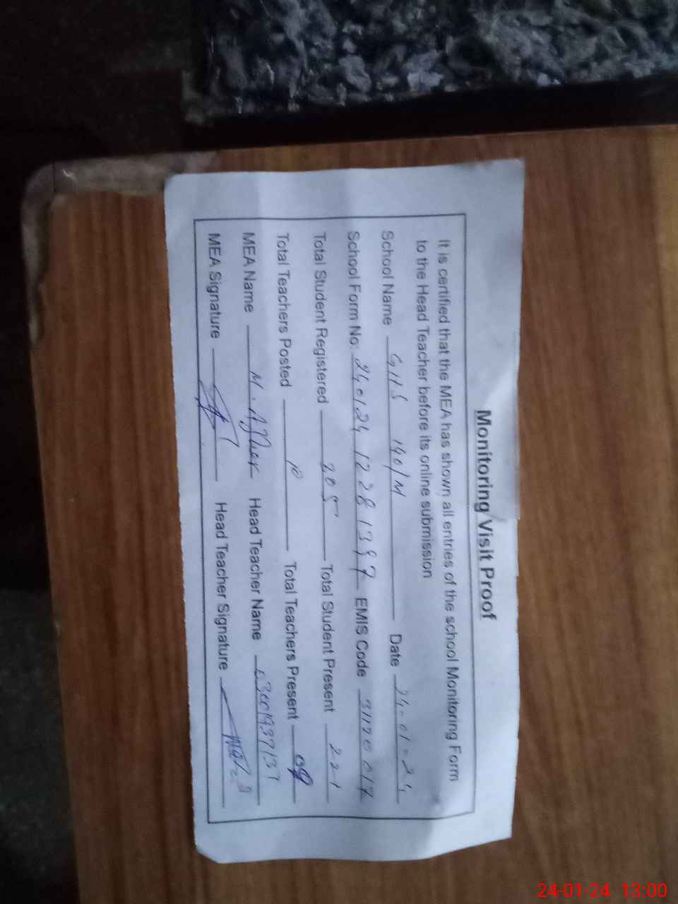 | Attendance Register | Head Teacher | MEA with School | Visit Proof |