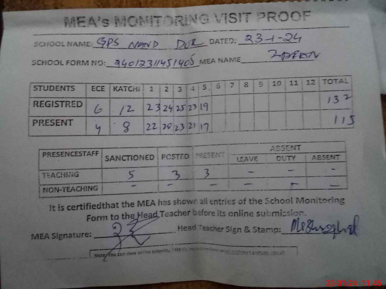 | Attendance Register | Head Teacher | MEA with School | Visit Proof |
