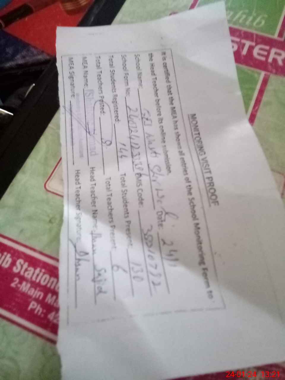 | Attendance Register | Head Teacher | MEA with School | Visit Proof |