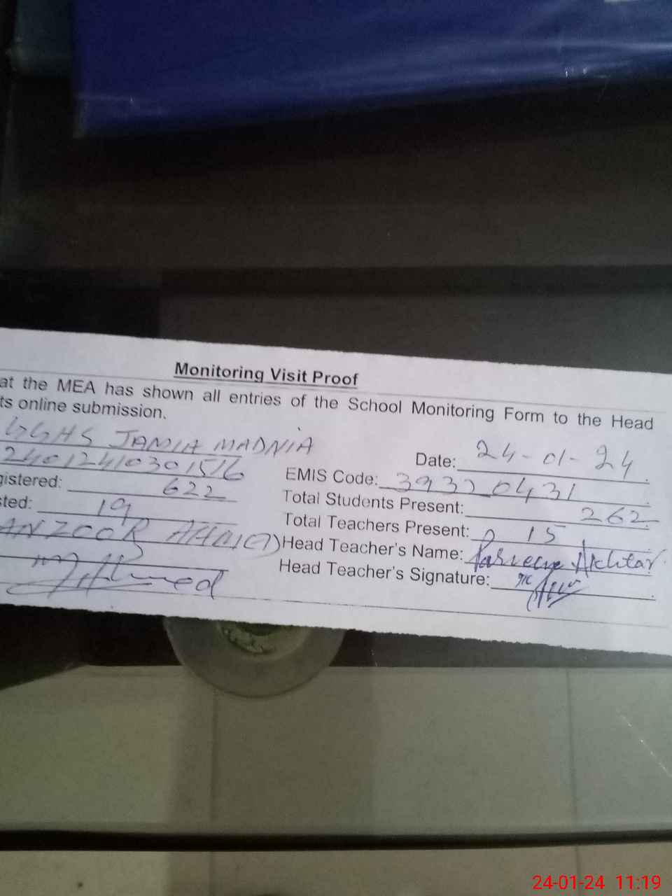 | Attendance Register | Head Teacher | MEA with School | Visit Proof |