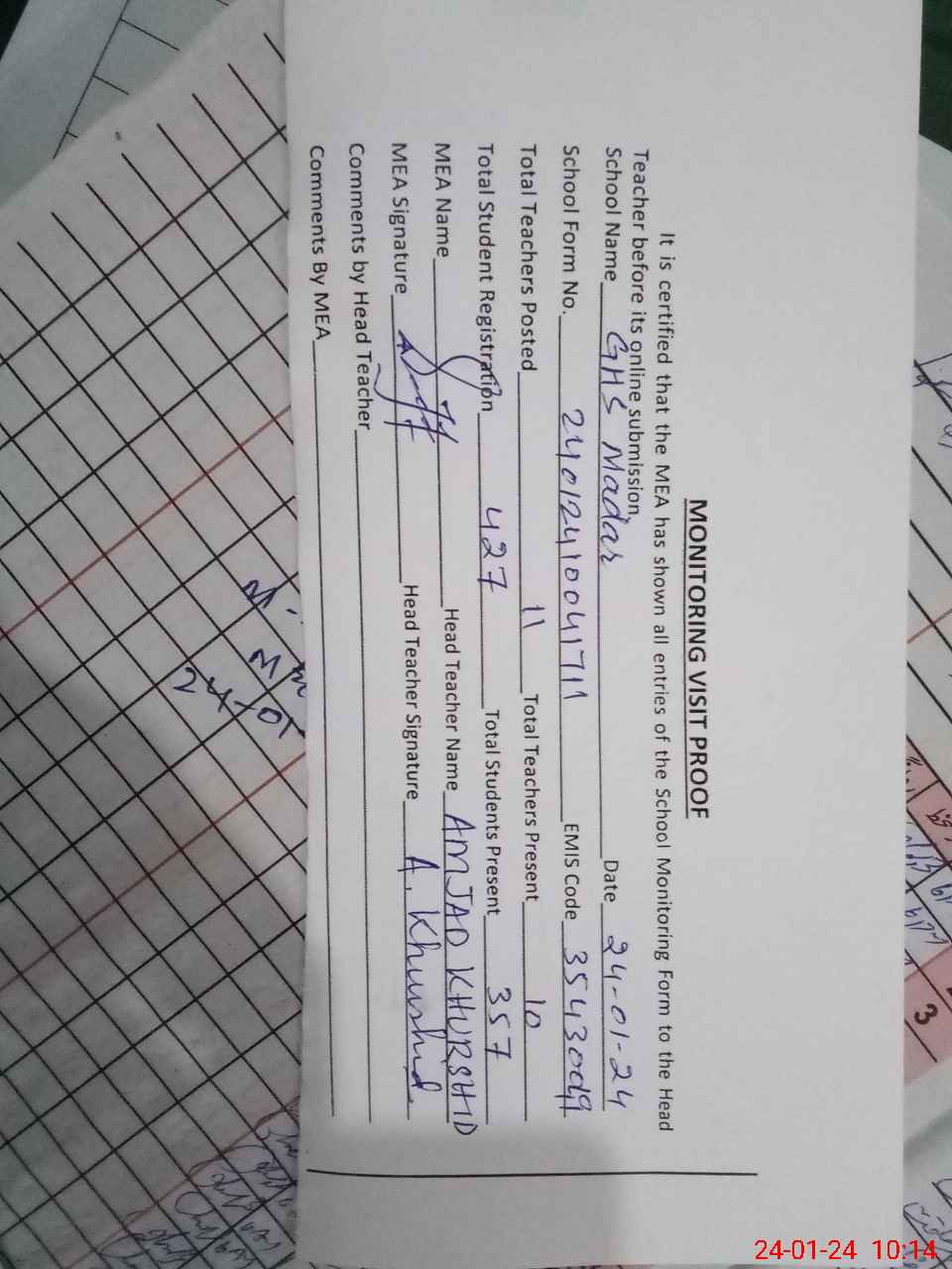 | Attendance Register | Head Teacher | MEA with School | Visit Proof |