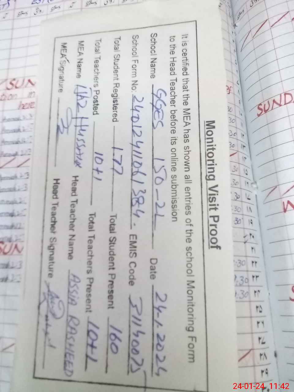 | Attendance Register | Head Teacher | MEA with School | Visit Proof |