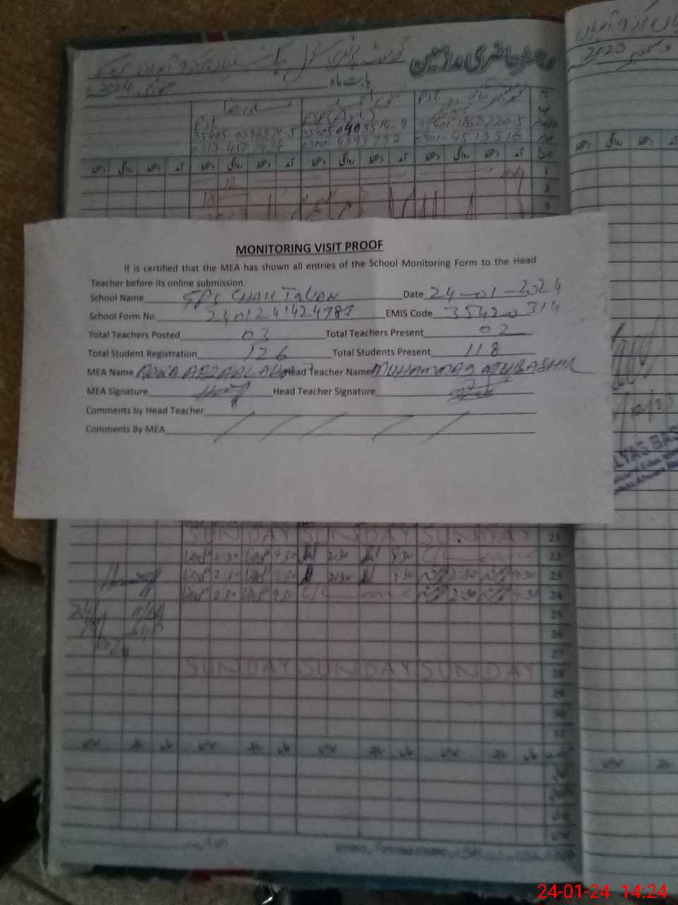 | Attendance Register | Head Teacher | MEA with School | Visit Proof |