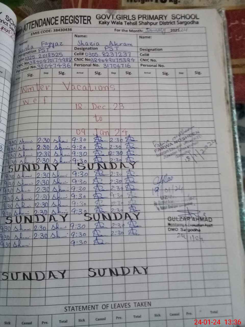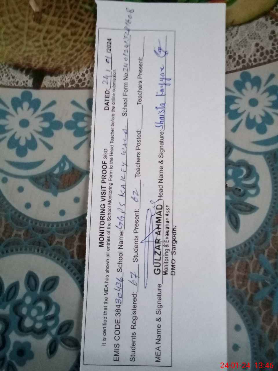| Name: SH**** FA**** Designation: (School Headmaster's/Headmistress's) PST Phone/Cell Number: 03**** |