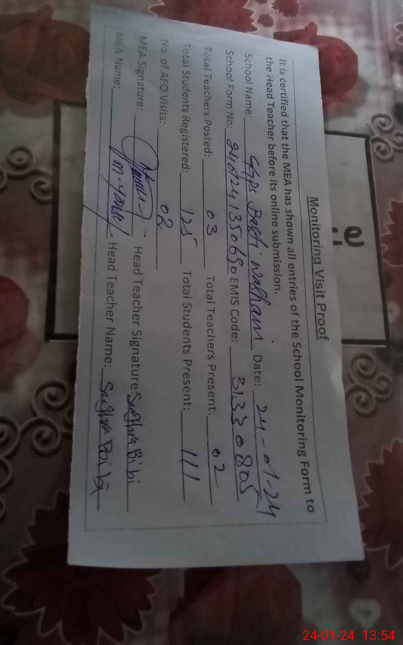 | EMIS Code: 31330805 | Name of School: GGPS BASTI WASHANI | |||