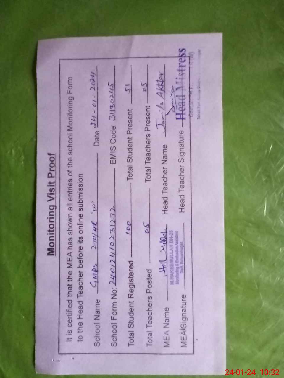 | Certified that this School was Inspected by the Undersigned MEA/DMO Today and the Information Stated Above is as Per Record. | |||||
