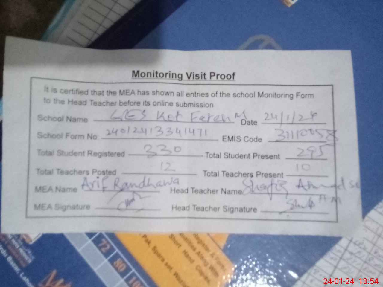 | Attendance Register | Head Teacher | MEA with School | Visit Proof |