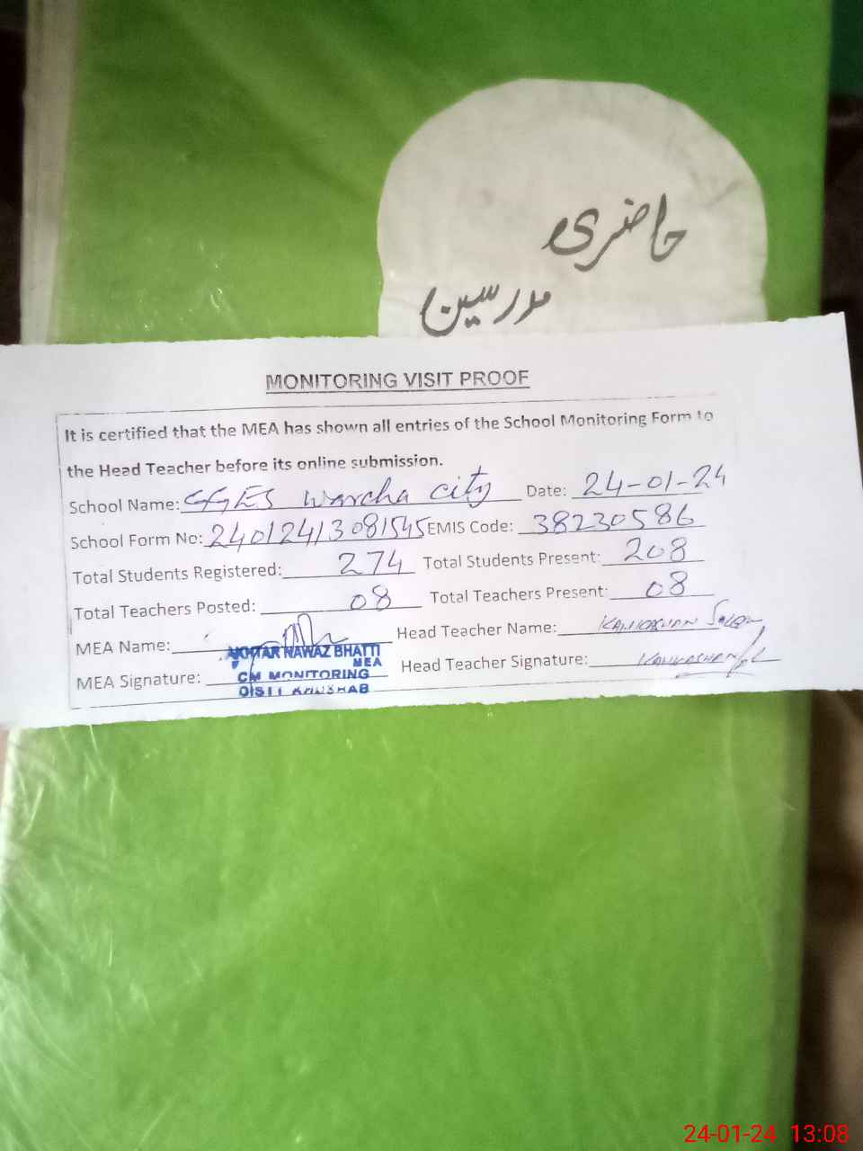 | Attendance Register | Head Teacher | MEA with School | Visit Proof |