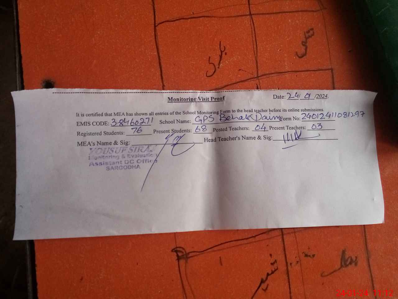 | Attendance Register | Head Teacher | MEA with School | Visit Proof |