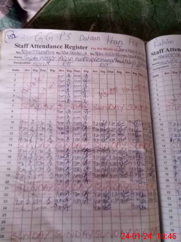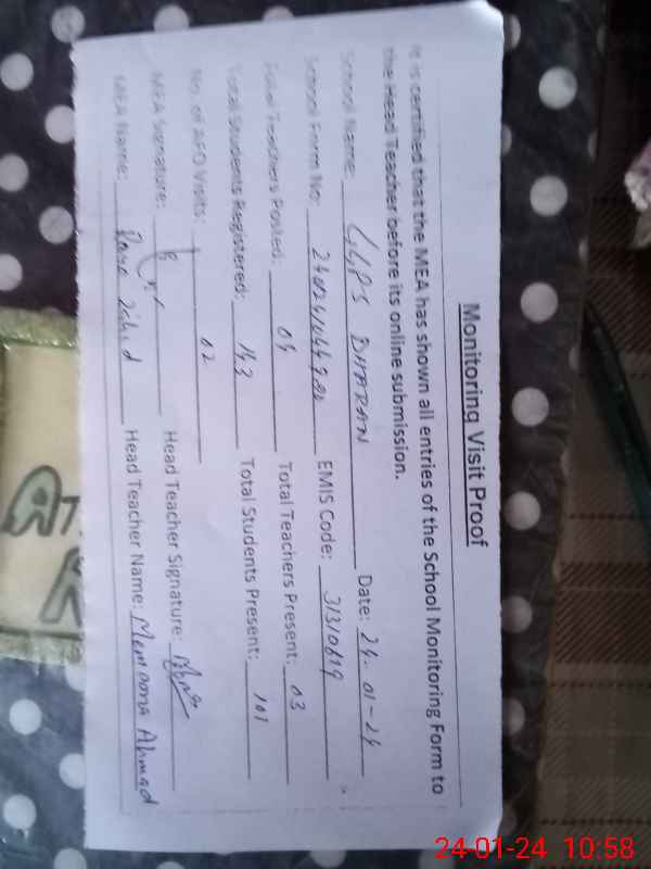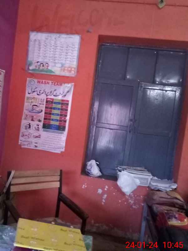 | Total no. of Classrooms: 2 No. of Classrooms Used for Teaching: 2 No. of Classrooms Storing Old Furniture, FTBs, etc: 0Comments if Any: Satisfactory and Books and NSB record no available in school and head teacher mst Sajida Nazir is absent from school and leave not approved on sis at visit time |