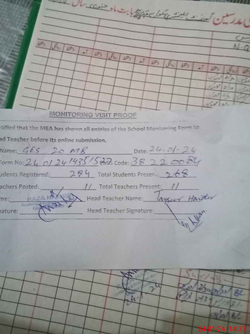 | Attendance Register | Head Teacher | MEA with School | Visit Proof |
