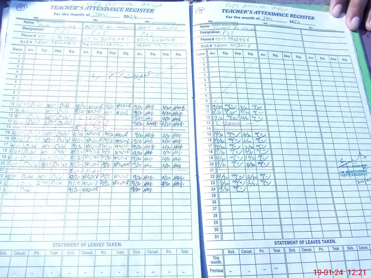 | CNIC | Full Name | Designation | R/C | Absence During Last Calender Month |