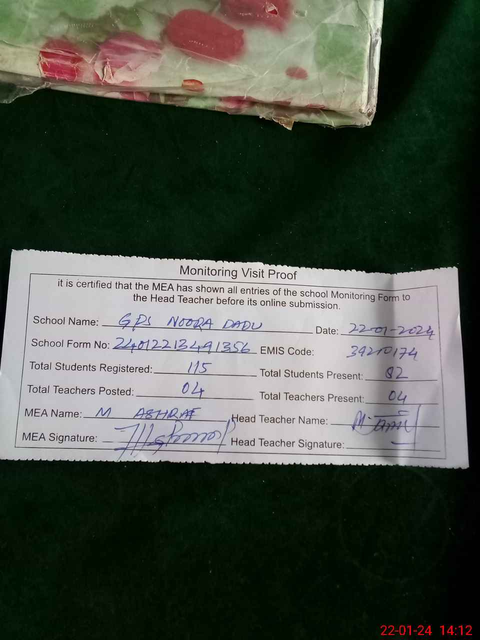 | Attendance Register | Head Teacher | MEA with School | Visit Proof |