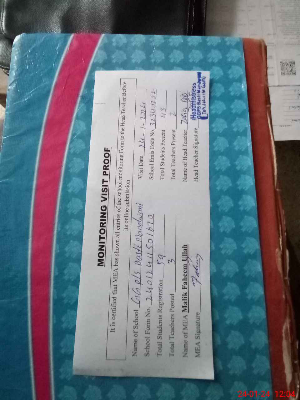 | Attendance Register | Head Teacher | MEA with School | Visit Proof |