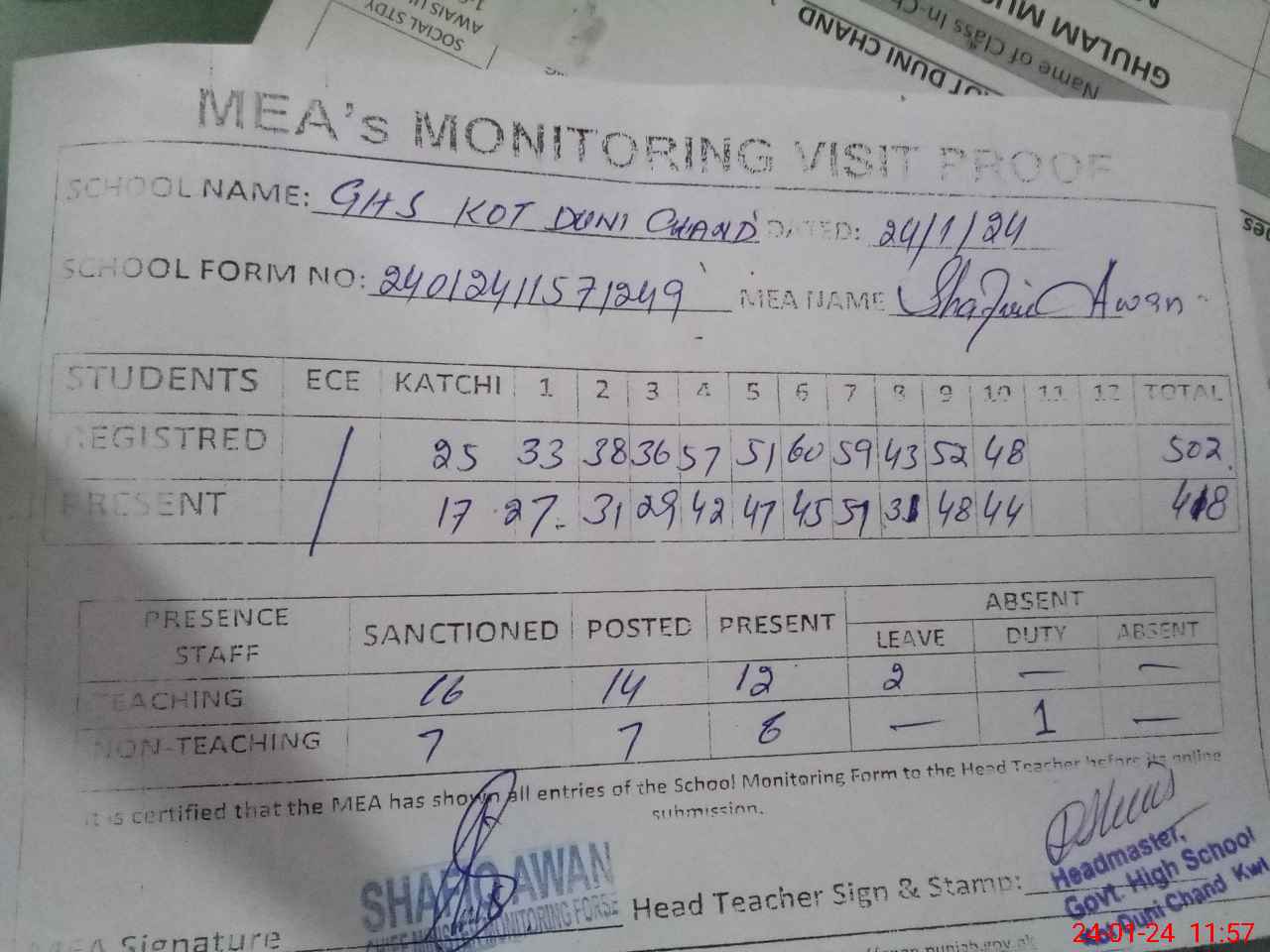 | Attendance Register | Head Teacher | MEA with School | Visit Proof |