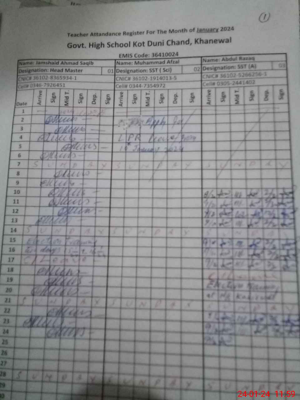 | CNIC | Full Name | Designation | R/C | Absence during last cal. month |