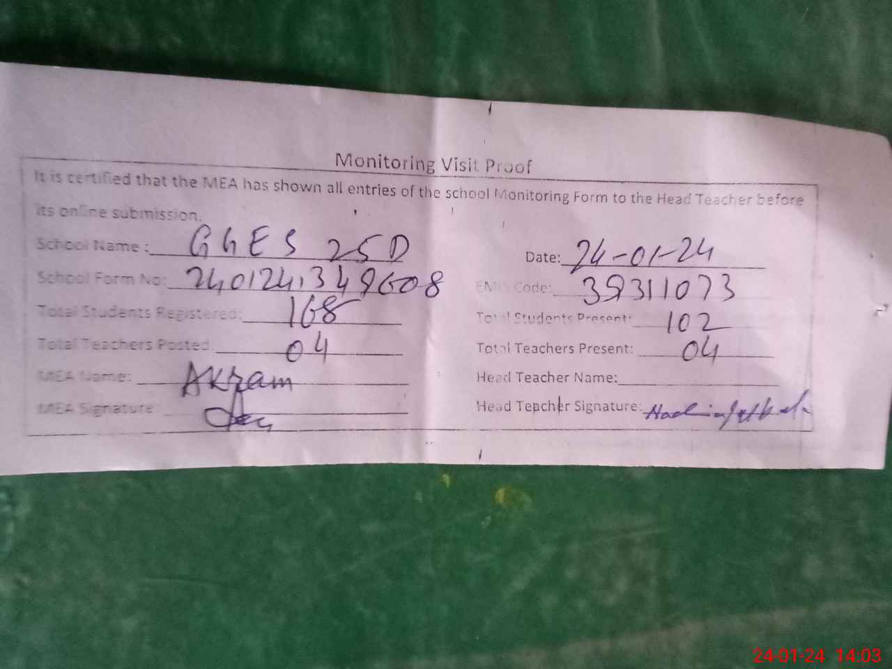 | Attendance Register | Head Teacher | MEA with School | Visit Proof |